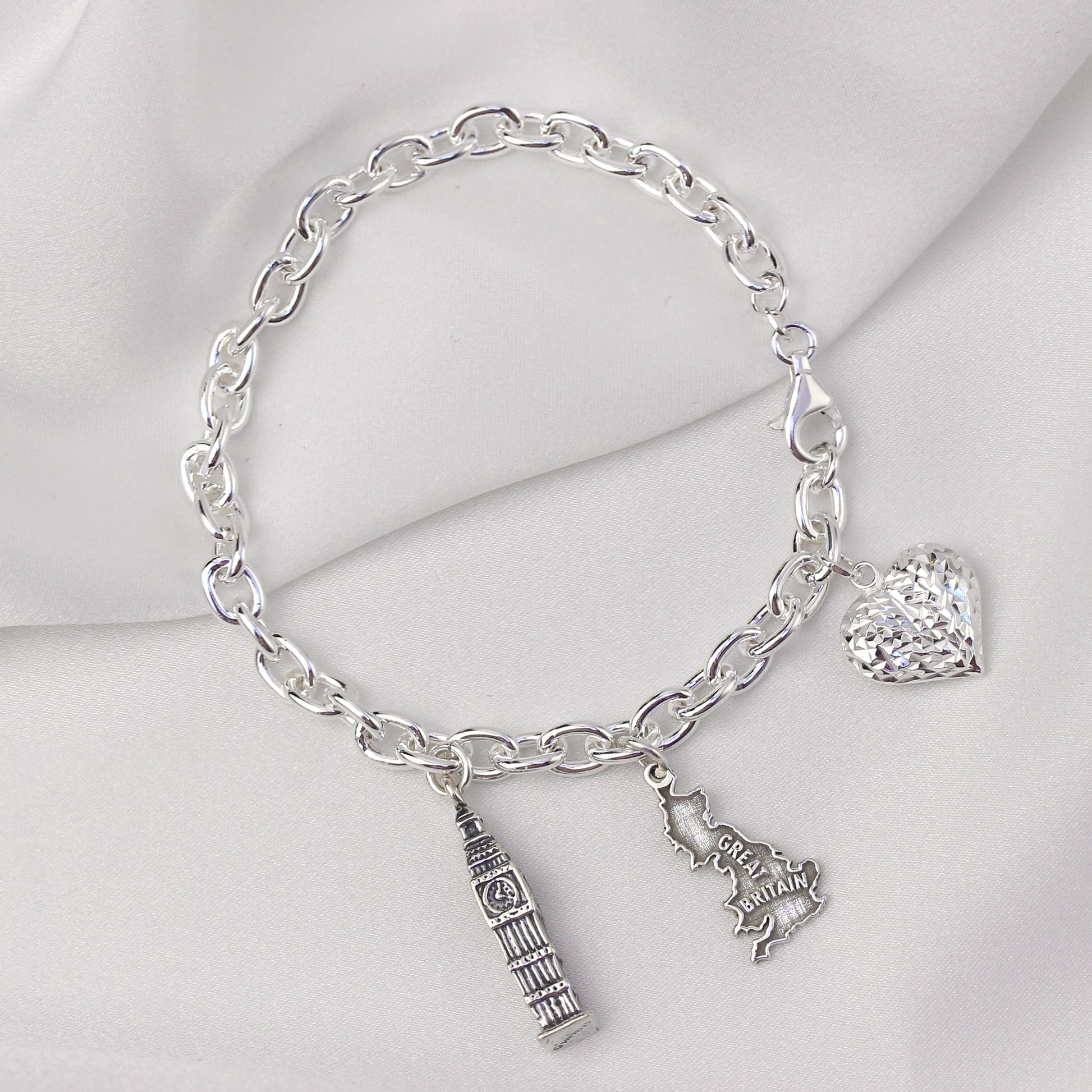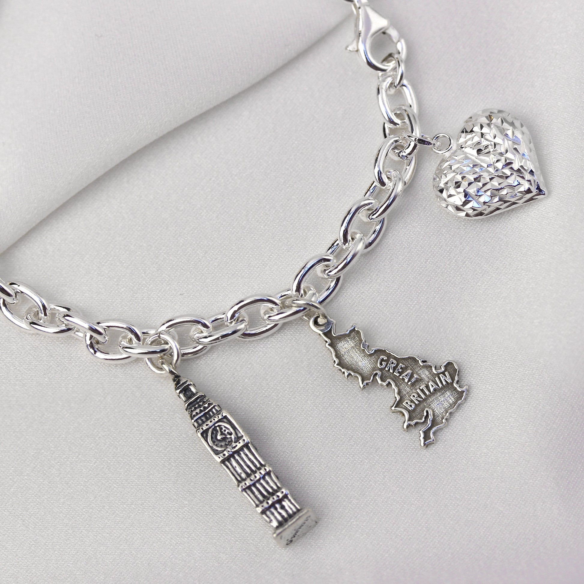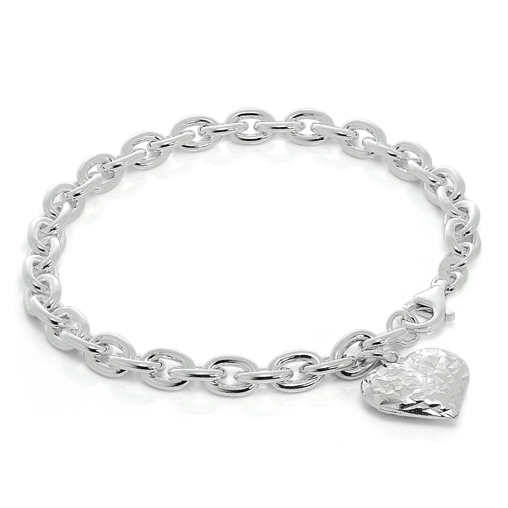 Heavy Sterling Silver Charm Bracelet with Diamond Cut Puffed Heart Charm
