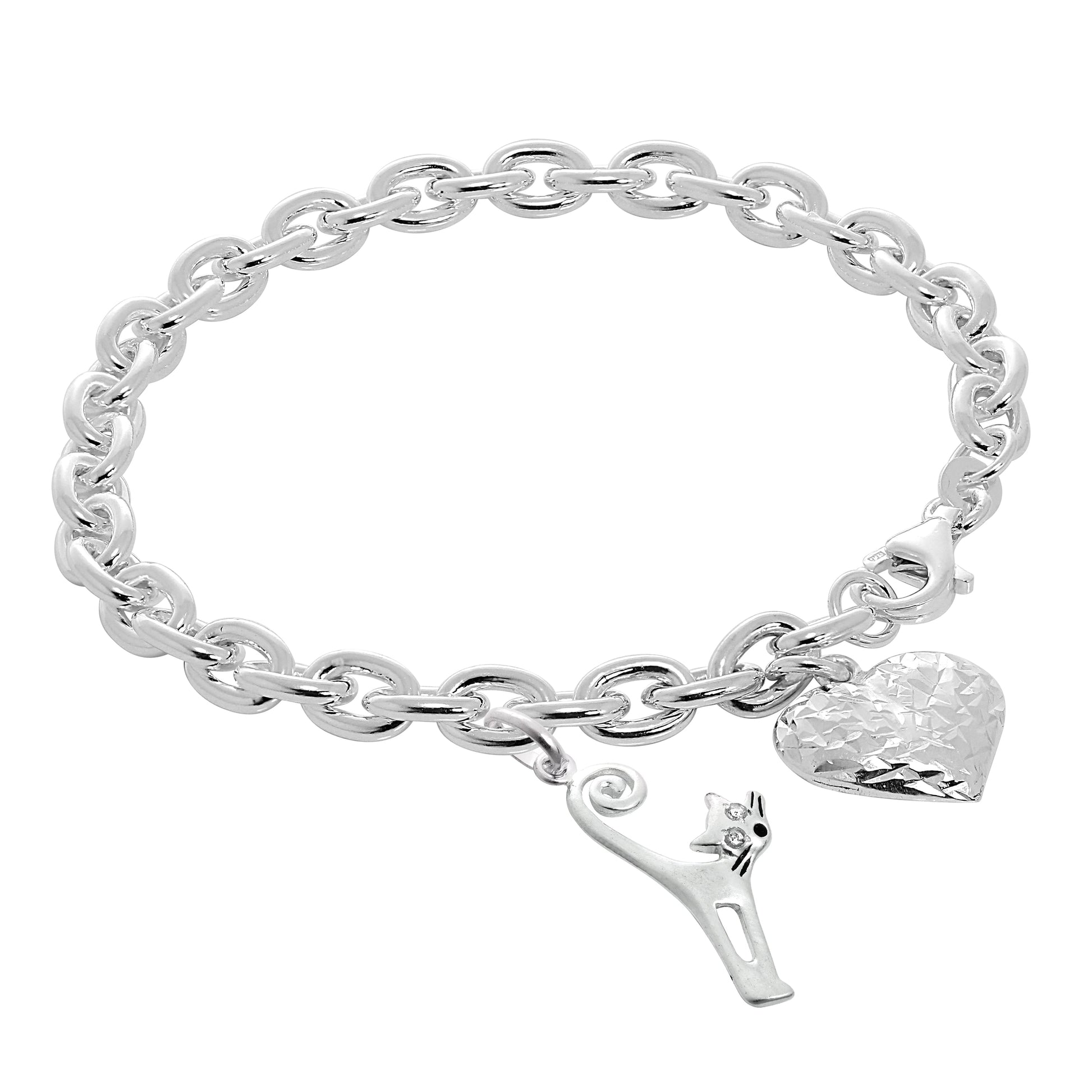 Sterling Silver Cat & Puffed Heart 7 Inch Starter Bracelet