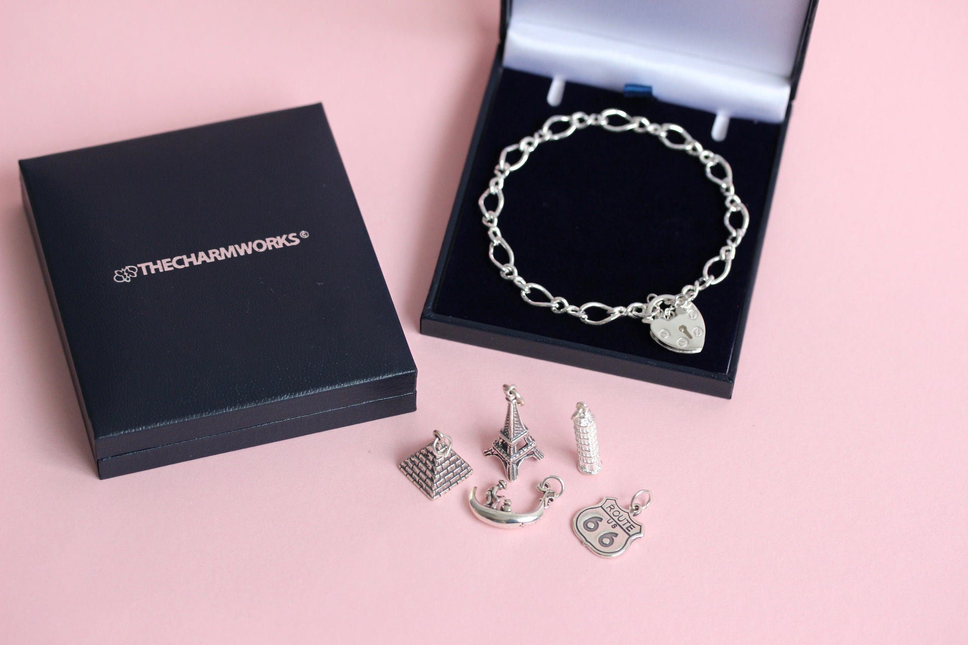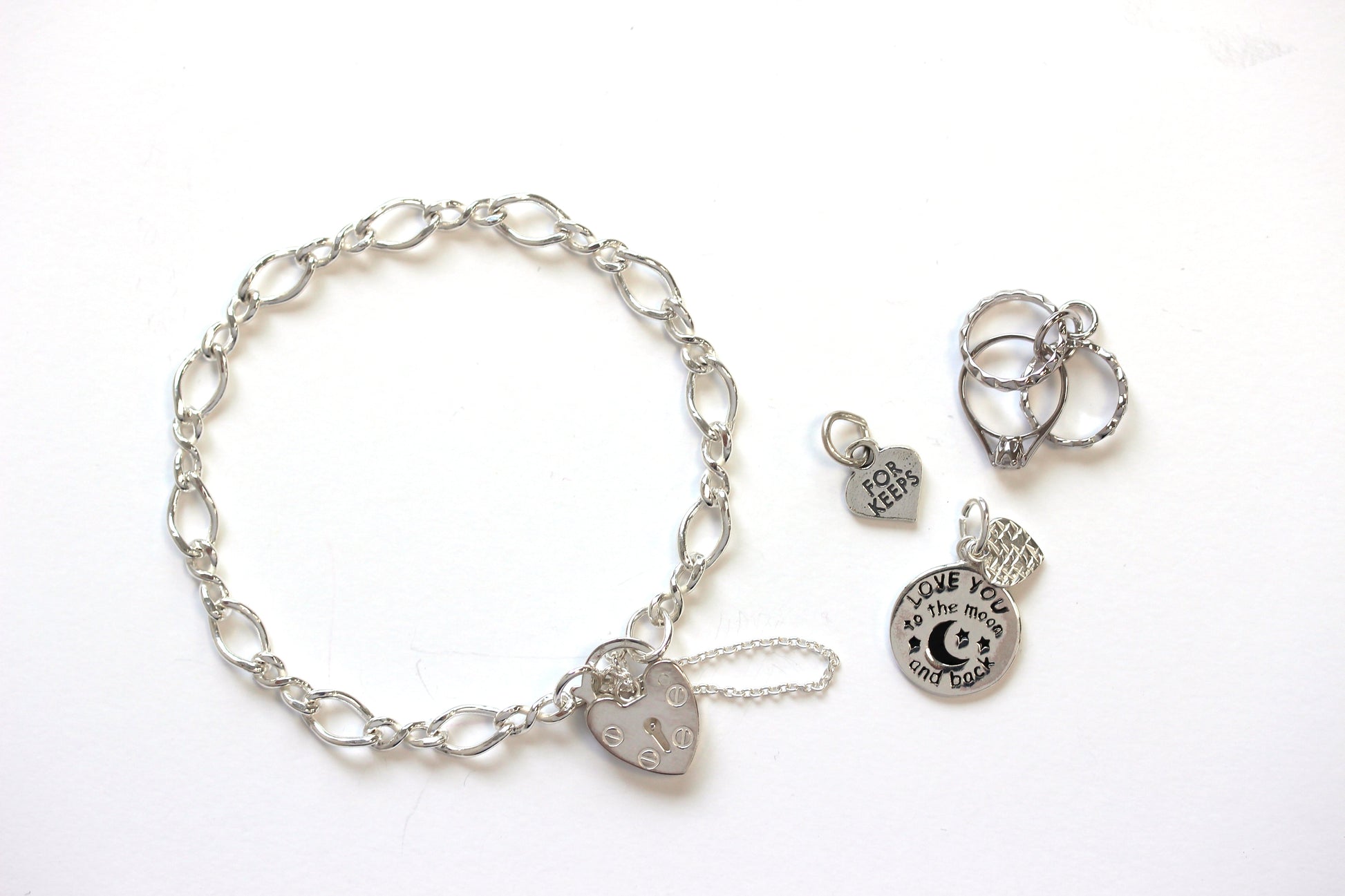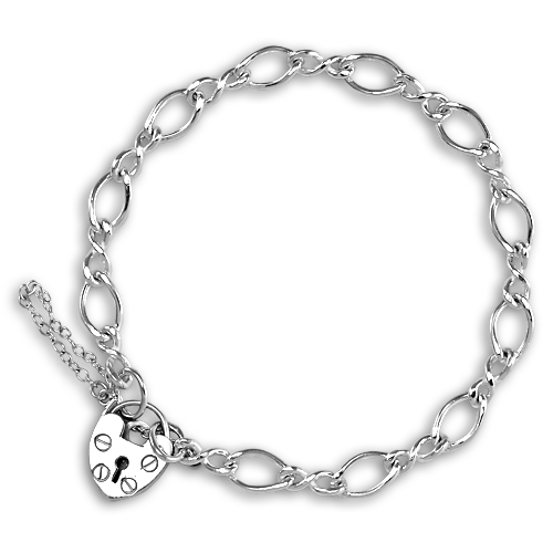Sterling Silver Figaro Chain Heart Clasp Charm Bracelet